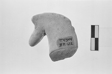 | Description: | Broken at base of neck, mane chipped. Horse's head, apparently cocked slightly to left. Traces of white slip. Buff-colored fabric, unglazed. | |