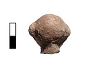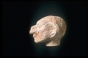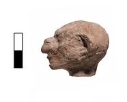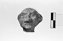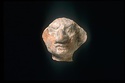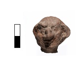 | Description: | Head preserved, broken at neck. Flaking surface, right ear worn away. Grotesque face with exaggerated nose, jaw and ears. Traces of white slip (?). Pinkish clay. | |