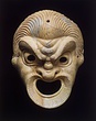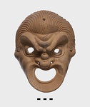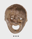 The eyes and nostrils are pierced. At the sides, level with the eyes, and ca. 0.03m. from the edge are small holes for attachment; another in the middle of the hair above the forehead.
