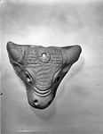 | Description: | Boukranion mask. Mended from three pieces. The eyes and nostrils pierced, and a hole in the forehead (for hanging ?). The forehead incised to represent hair. Remains of red color on the face. | |