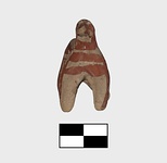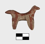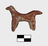 | Description: | A quadrupted with head rather small for a horse, and short tail sticking out horizontally behind. Three red stripes across chest, three down back, one down each leg, one around rump. Red glaze. Gray clay. | |