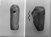 Its rounded flattened head on which air and features are drawn interrupts the flow of folds and features gougings. Folds continued all round top part of back, as if a shawl is represented. Just under this at back, large vent hole, under which is the signature: K Y.