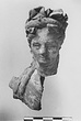 | Description: | Head and bust of a draped woman, crowned with heavy wreath of leaves. The wreath tied at the back by ribands whose square ends fall to the shoulder, beside long tresses of hair. There is an elleptical hole at the back of the neck. White painted. Traces of pink color on drapery, and of yellow on hair. ADDENDA: Leaves over a thick wreath. Rather dull modelling. Blond clay. | |